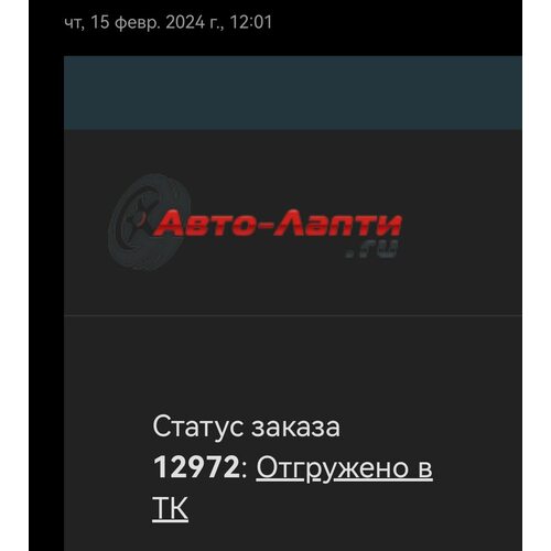 Химич Сергей Владиславович Мелитополь 01.11.2024 Добрый день! Благодарен компании Авто-Лапти за отличный сервис. Сделал заказ и получил на эл.почту что шины есть в наличии и сколько будет стоить доставка до моего города. Оплатил всю сумму вместе доставкой и через 12 дней получил заказ. В ожидании заказа получал от них письма когда заказ был отправлен и даже когда прибыл то тоже получил письмо что заказ прибыл и готов к выдаче. Шины новые, уже переобулся. Спасибо! |